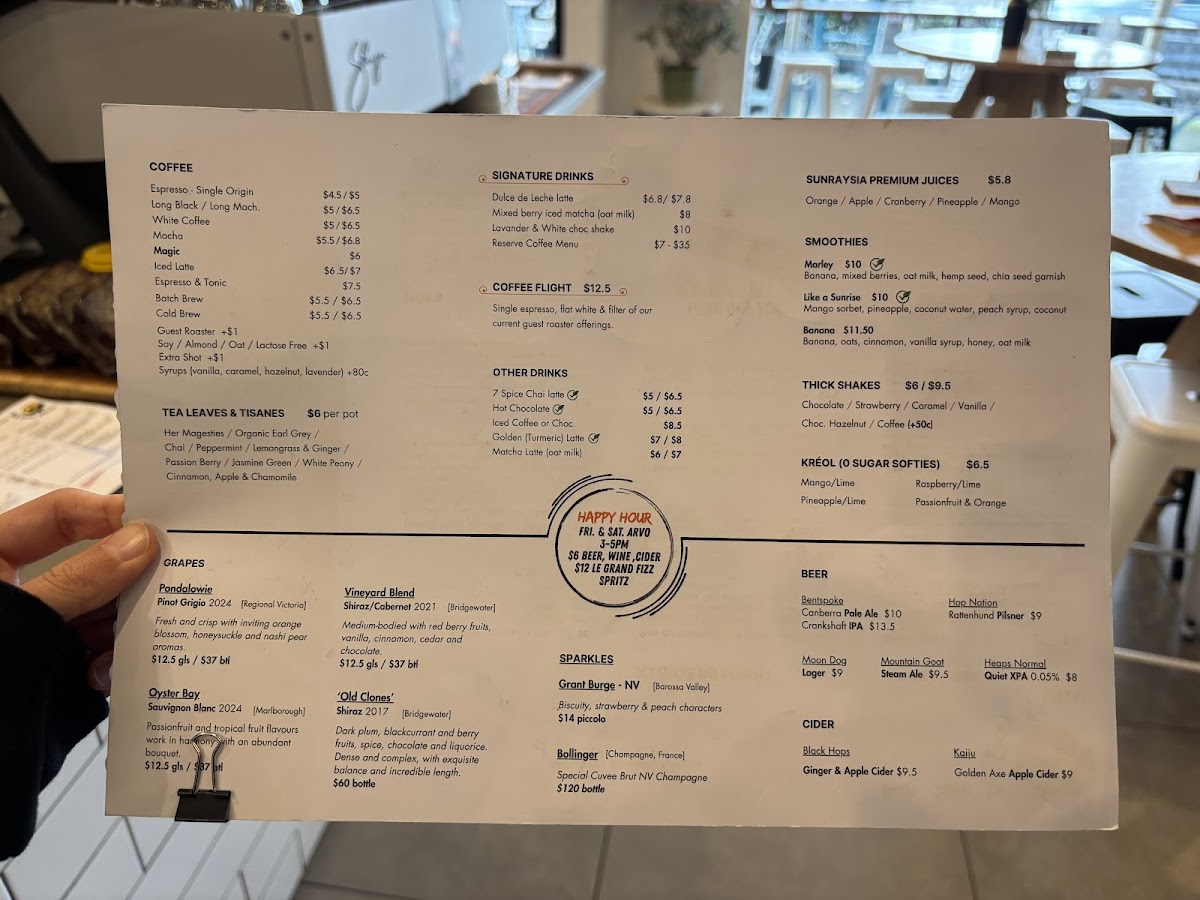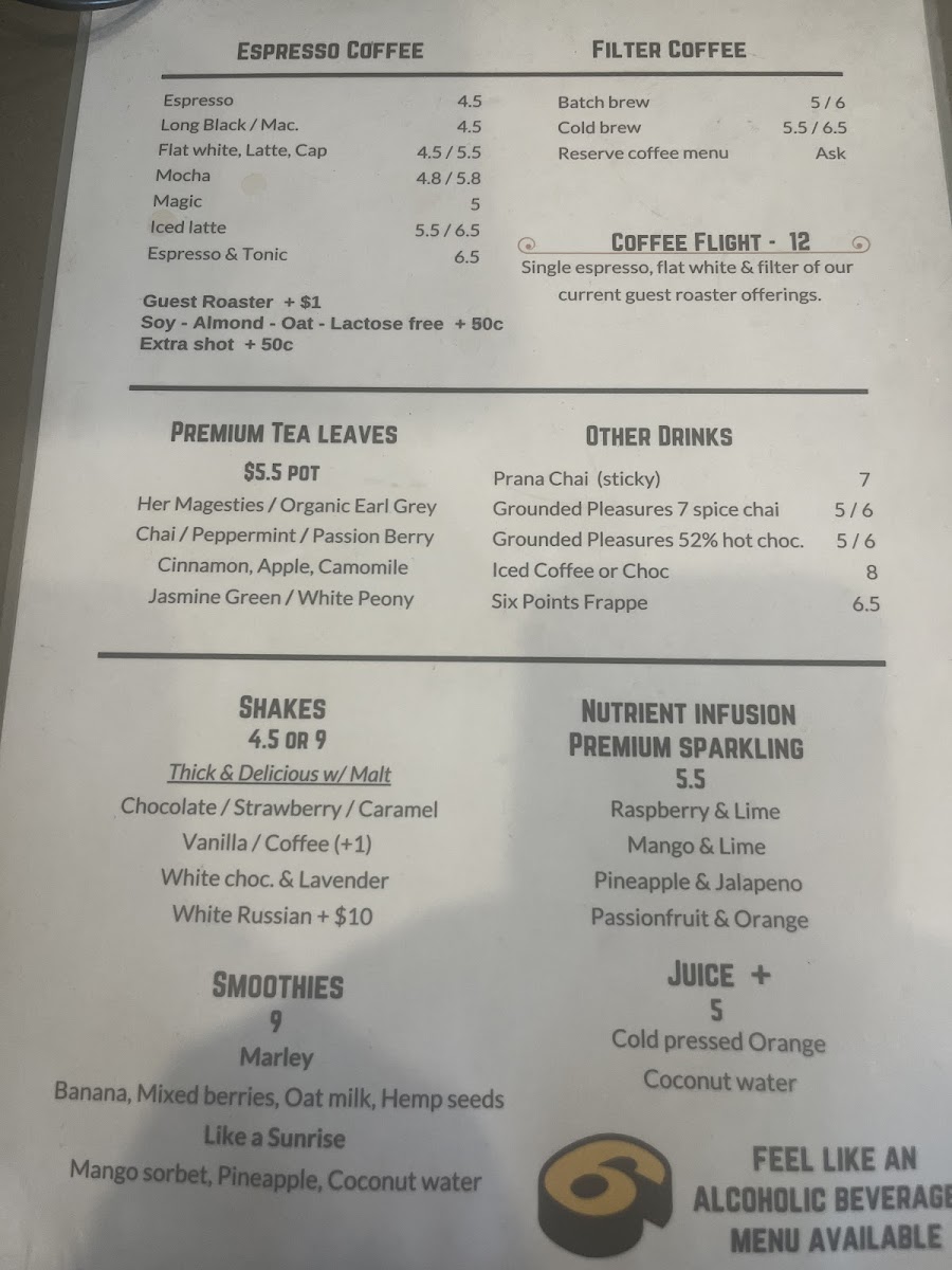 For beverages, the menu includes a comprehensive coffee selection, ranging from espresso-based drinks like flat whites, long blacks, triple espresso iced coffee, and iced lattes to specialty coffee flights and frozen coffee varieties prepared using single-origin beans. Additionally, there are cold-pressed juices, smoothies, thick shakes with malt or adult variations, and a selection of craft sour beers such as lemon passionfruit sour beer.